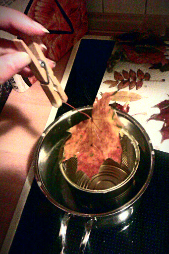 | Choose your favorite leaves, fetch them with the pin and dip them into the melted wax for a second. Take it back out and put it on the pad to let it dry. Be sure the leaves don´t stick to your underlay as they dry. We made a little pile of already waxed leaves in the end. |